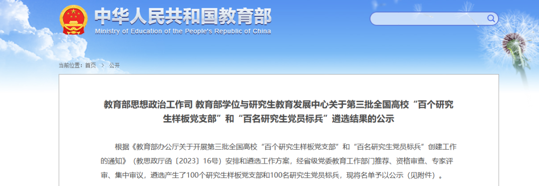 根据《教育部办公厅关于开展第三批全国高校“百个研究生样板党支部”和“百名研究生党员标兵”创建工作的通知》(教思政厅函〔2023〕16号)安排和遴选工作方案,经省级党委教育工作部门推荐、资格审查、专家评审、集中审议,遴选产生了100个研究生样板党支部和100名研究生党员标兵。