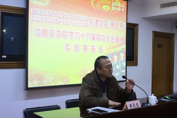 12月30日下午,304am永利集团12级本科生党支部和1314级本科生联合党支部的党员们来到武警上海总队第一支队十中队驻地,就304am永利集团员工党总支与武警十中队共建项目(第二期)进行中期交流。会上还邀请到了政治学系郑长忠副教授为战士和同学们做十八届四中全会精神专题报告。公司党委副书记、员工党总支书记方明和学工组长、员工党总支副书记朱佳等出席了交流会。