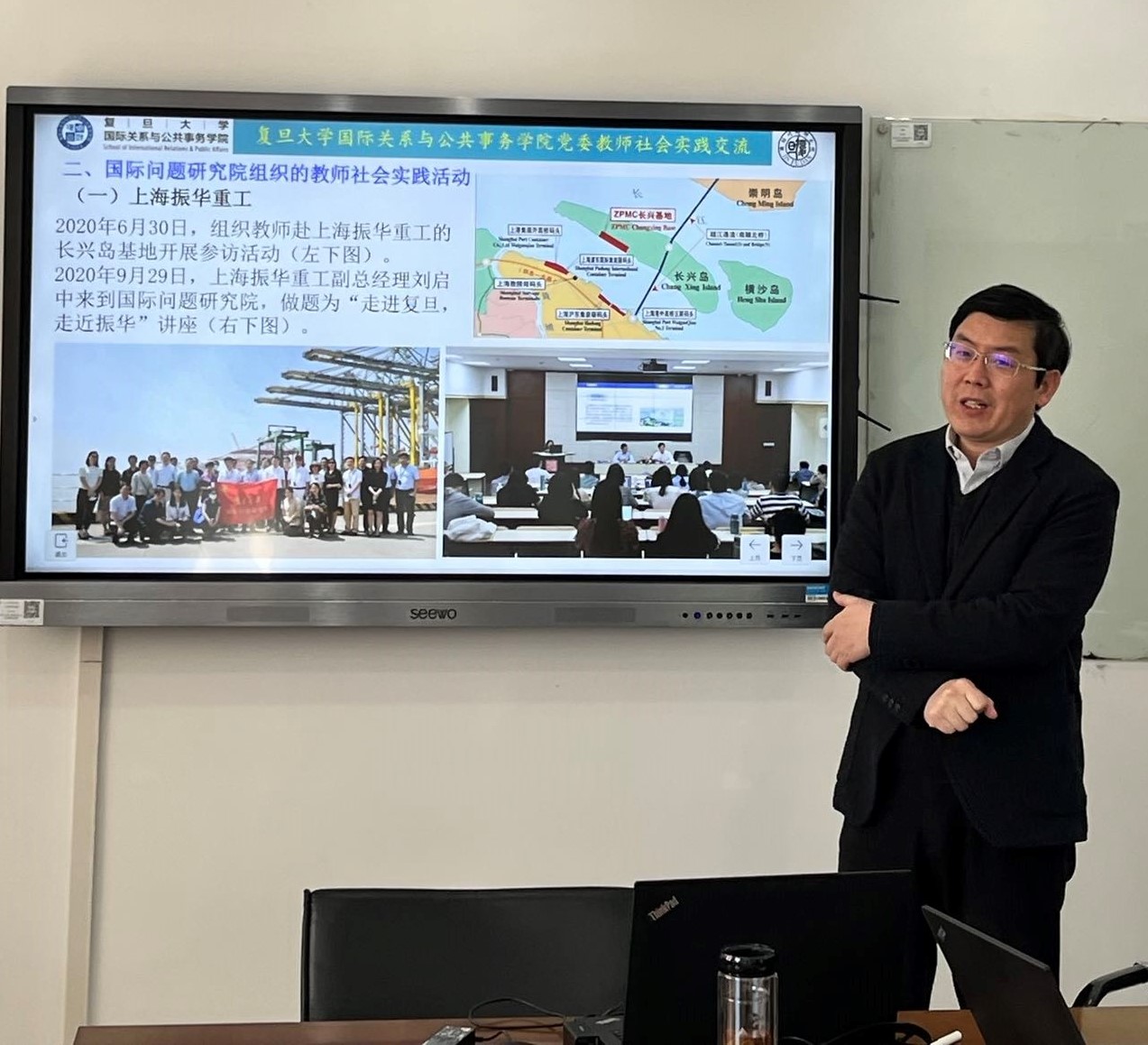 会议第一个议程由党委委员、原国际问题研究公司党支部书记祁怀高介绍国研院教师社会实践经验。祁老师按照校级专项社会实践、院系特色社会实践、骨干教师专项社会实践三个层面展开。他特别介绍了上海振华重工长兴岛基地、蓝箭航天、上海海事局三次社会实践并详细说明了组织过程,从支委会策划、发函、组织过程等具体展开,他指出组织教师社会实践有3个要点,一是要紧密结合学科专业领域,二是要将教师的学术研究与实务机构的需求对接,三是基层党组织要发挥重要的组织协调作用。与会的支部书记纷纷表示受益良多,为自己的工作打开了思路。